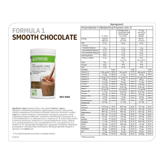 • Formula 1 har et høyt proteininnhold som bidrar til økt muskelmasse. Formula 1 er en måltidserstatning som inneholder essensielle mikro- og makronæringsstoffer og som er tilsatt planteingredienser og urter.